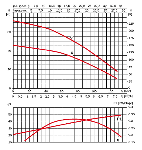 Моноблочный многоступенчатый центробежный насос с вертикальным напорным патрубком с внутренней резьбой. Всасывающий фильтр, расположенный в нижней части насоса, предотвращает доступ крупных предметов в гидравлическую часть. Рабочие колеса смонтированы непосредственно на удлиненный вал мотора. Промежуточная маслонаполненная камера служит для смазки и охлаждения двойного уплотнения вала и обеспечивает абсолютную герметичность мотора. Нижняя опора устраняет возможность вибрации и гарантирует мягкость и бесшумность работы. Мотор переменного тока имеет внутреннее охлаждение за счет температуры перекачиваемой жидкости проходящей между корпусом насоса и кожухом мотора. Самосмазывающиеся подшипники снимают аксиальные напряжения с вала и не требуют обслуживания. Однофазное исполнение со встроенной тепловой защитой с автоматическим перезапуском и конденсатором.Данные мотора